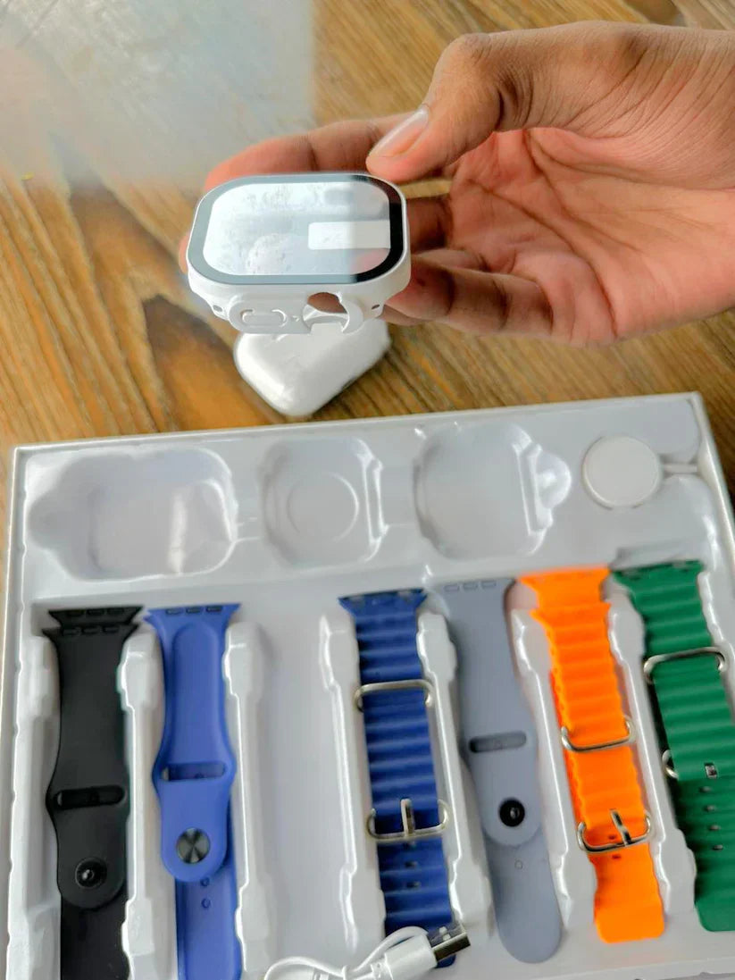 20 Ultra Max Suit (10-in-1 Set) – Smartwatch with 7 Plain Color Straps and AirPods – Complete Combo for Men and Women