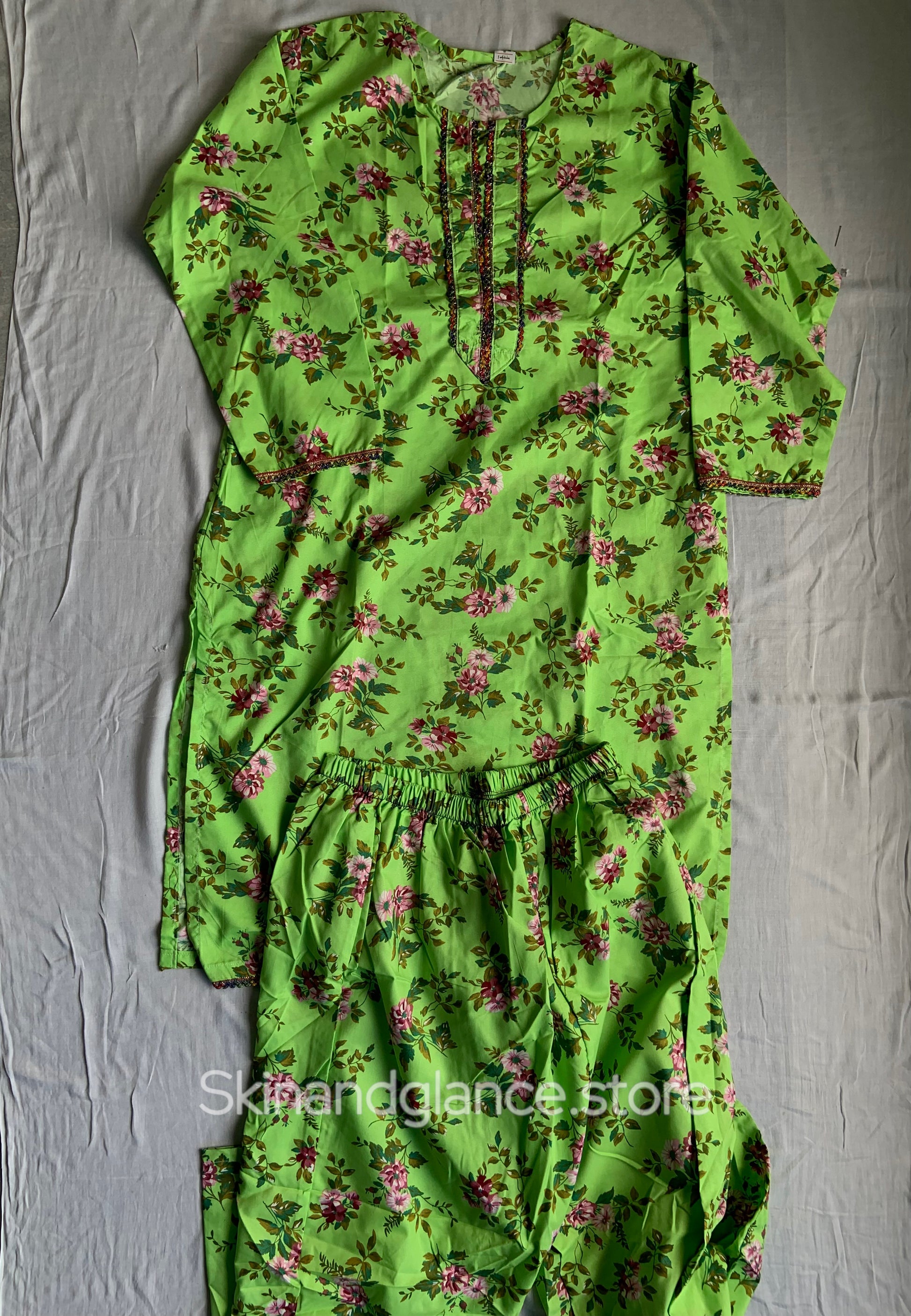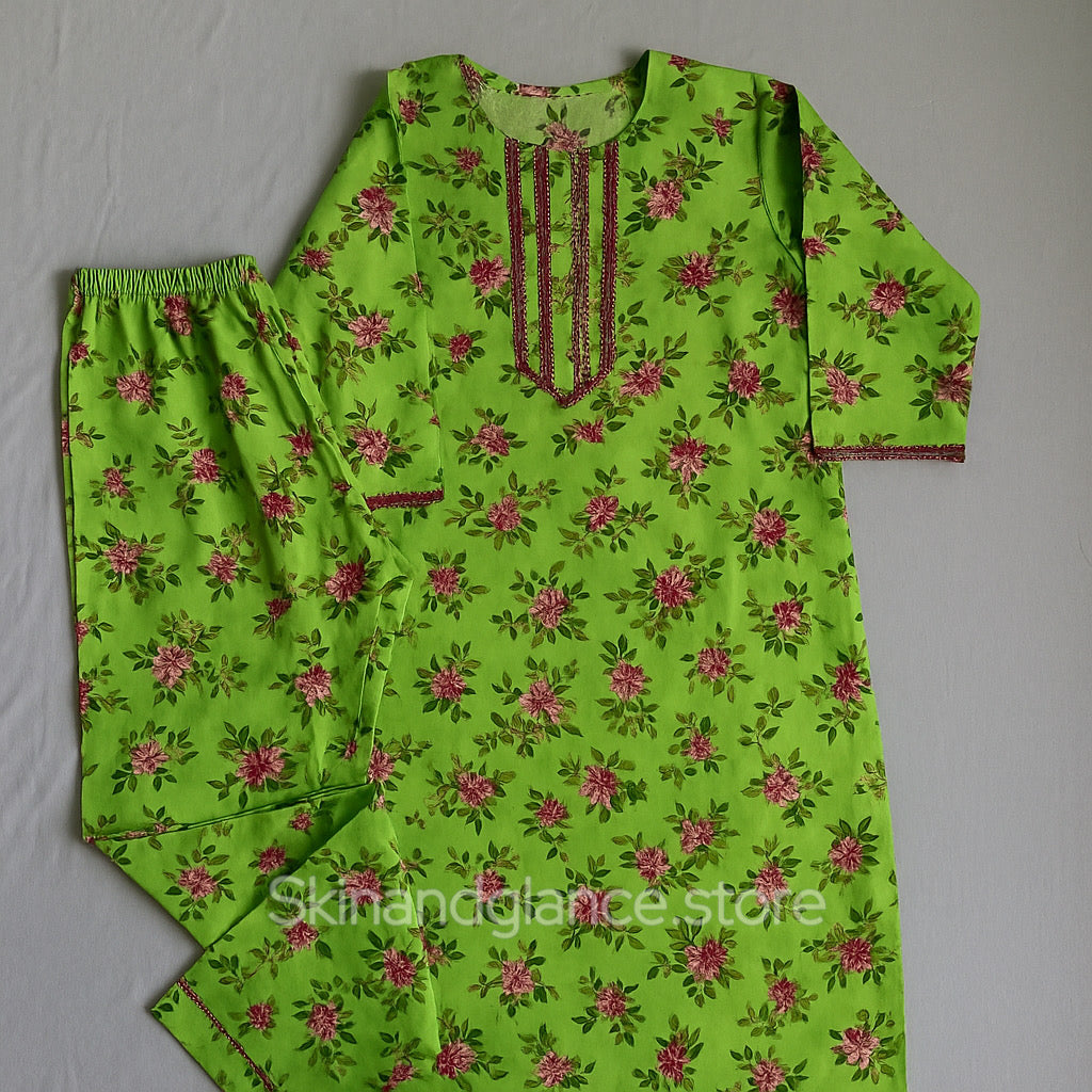 This lively green co-ord set with pops of pink blooms is the definition of feel-good fashion! Comfortable, colorful, and made to brighten up your day β one petal at a time. πΏβ¨
