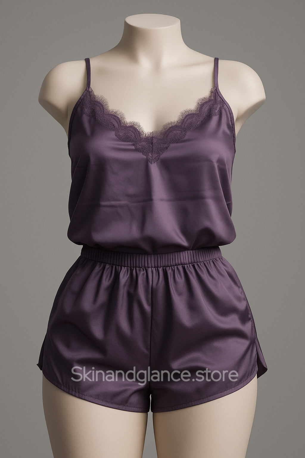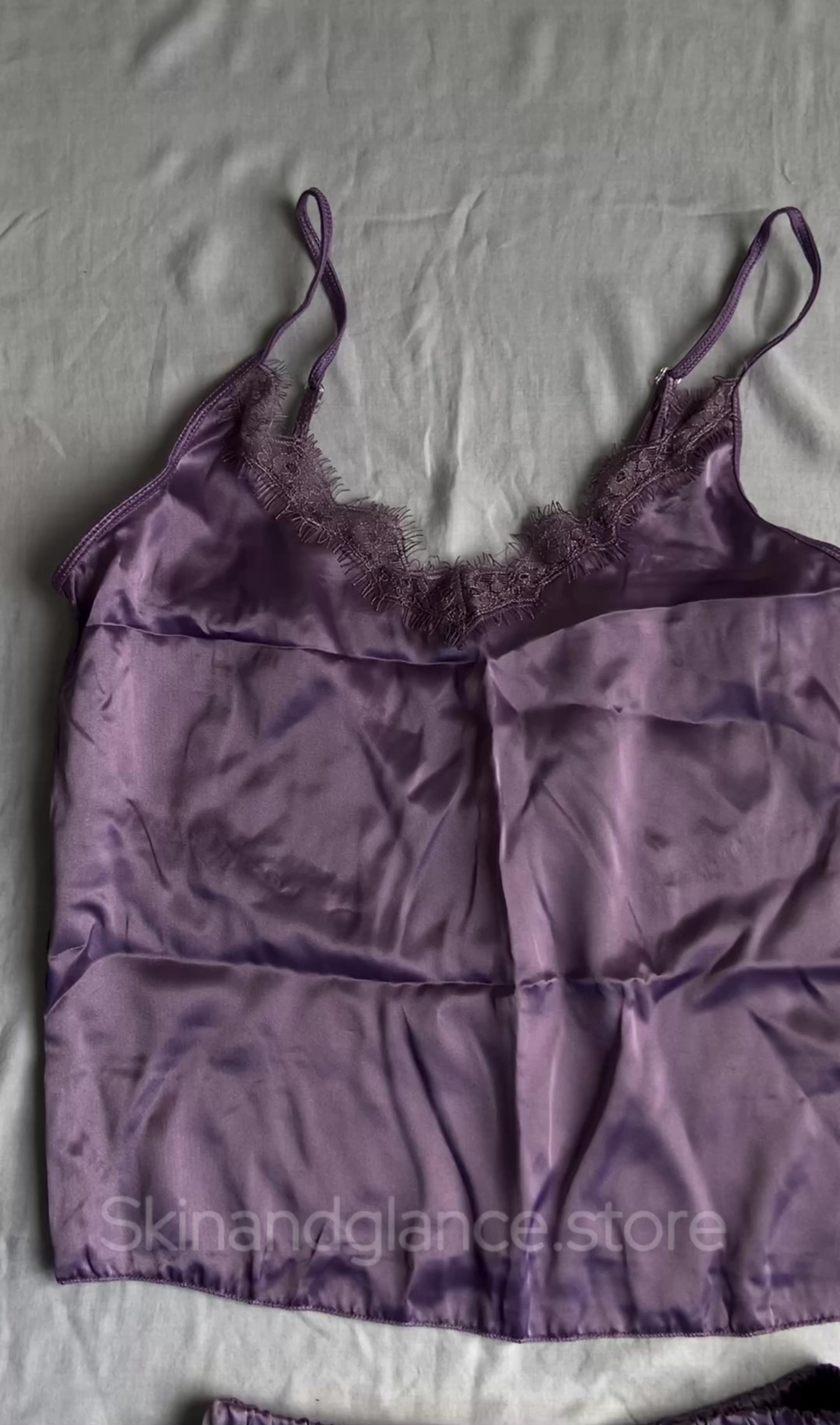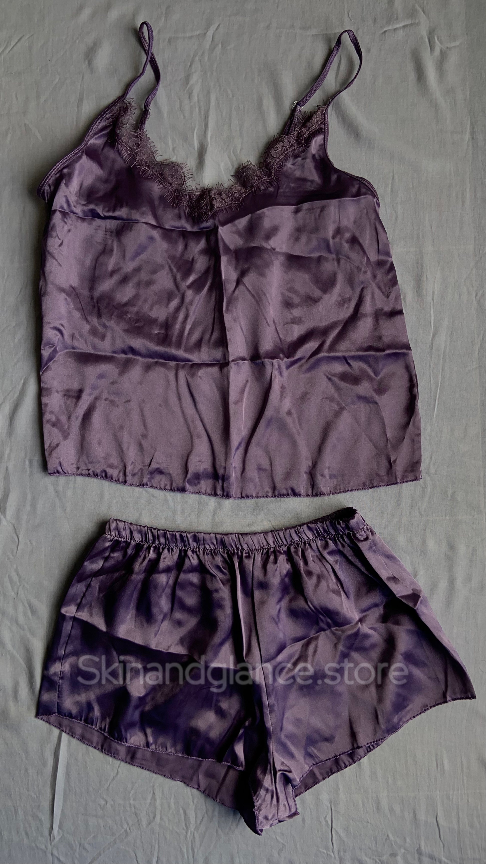 Slip into this plum satin cami set for the ultimate blend of comfort and charm. With delicate lace details and a relaxed fit, bedtime never looked so good. βœ¨πŸŒ™
